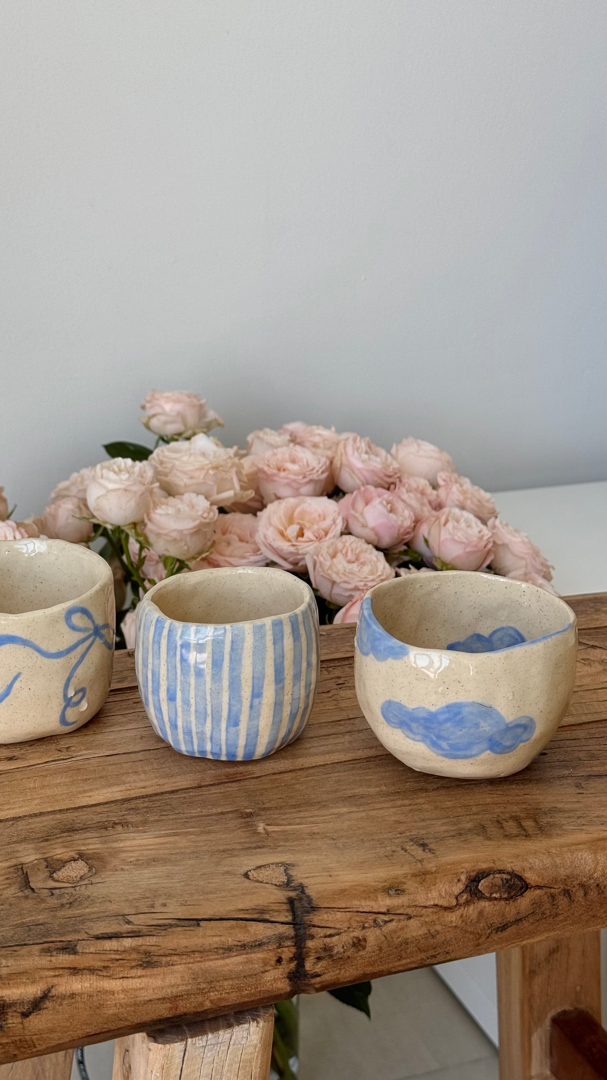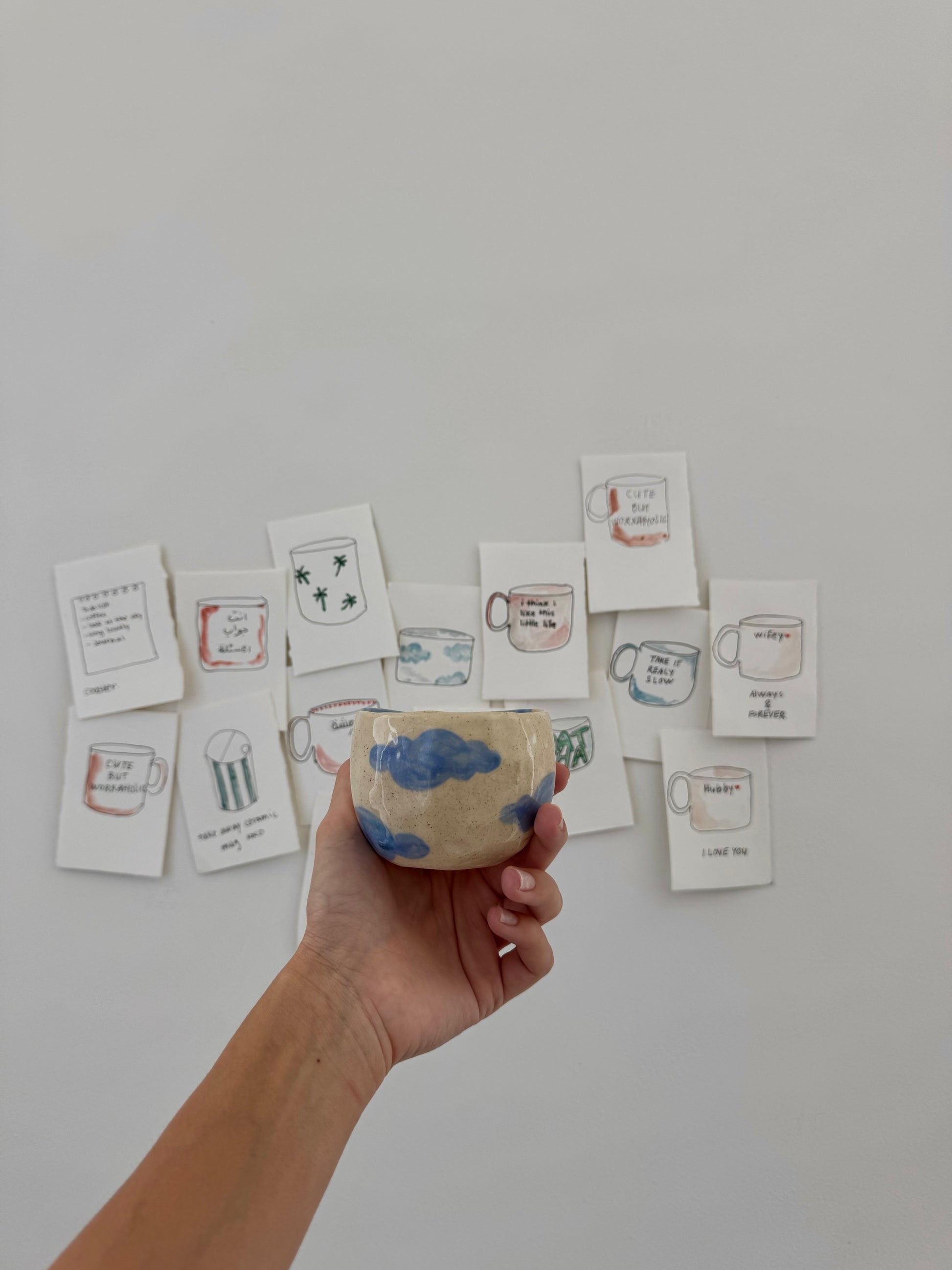 A large hand made ceramic mug made from clouds, fluffy fluffy clouds.