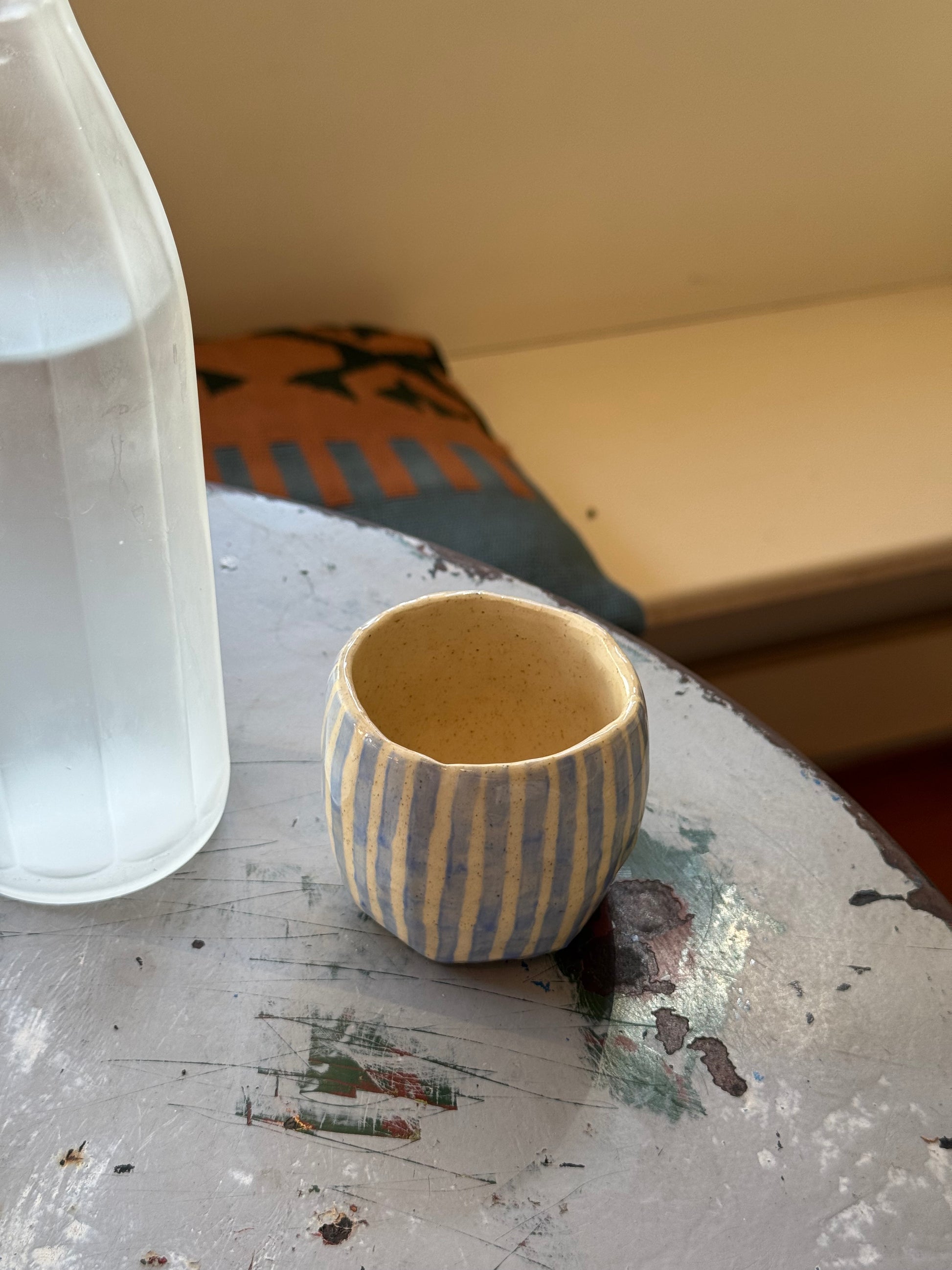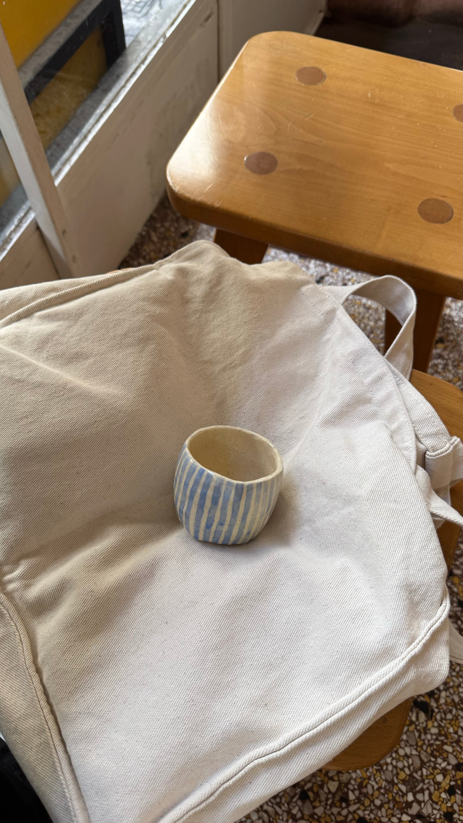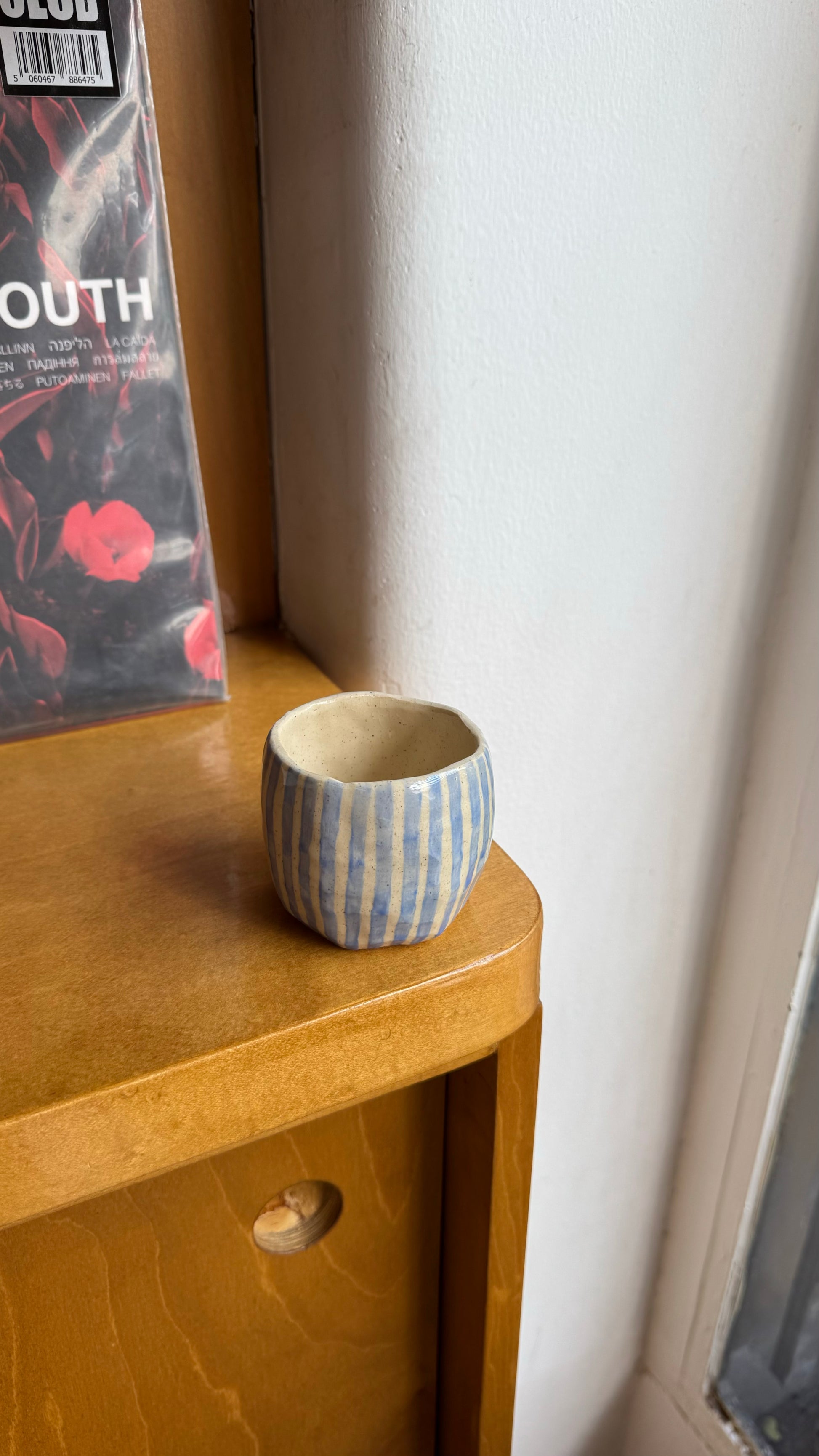 A handcrafted Blue Breeze Mug, designed with simplicity and style in mind. This handle-free ceramic mug features delicate light blue lines, adding a touch of tranquility to your sipping experience. Perfect for any beverage, this unique piece brings both modern elegance and artisan quality to your collection.